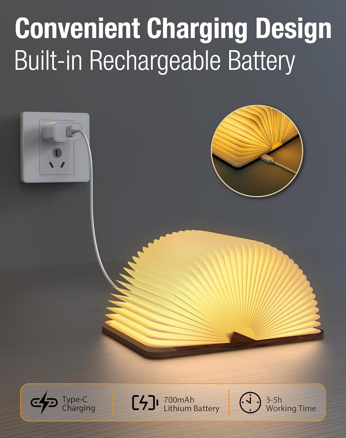 PORTABLE AND FOLDABLE LAMP: The wooden book lamp features a sleek design, capable of self-folding and providing 360° illumination. The magnetic design ensures easy setup and usage, allowing for the creation of various shapes, both practical and decorative