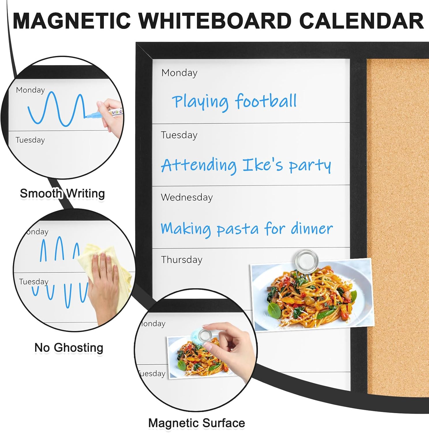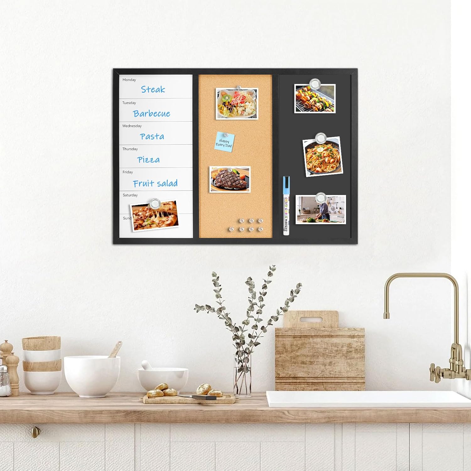 3-IN-1 Combination Board: Perfect combination meets all your requirements. Our Chalkboard and Calendar Whiteboard uses high-quality porcelain steel, and the corkboard is made of high-density cork, which allows you to pin notes, to-do lists, photos and plan. The magnetic surface of chalk board and whiteboard calendar can be used with magnets to keep notes and information in place
