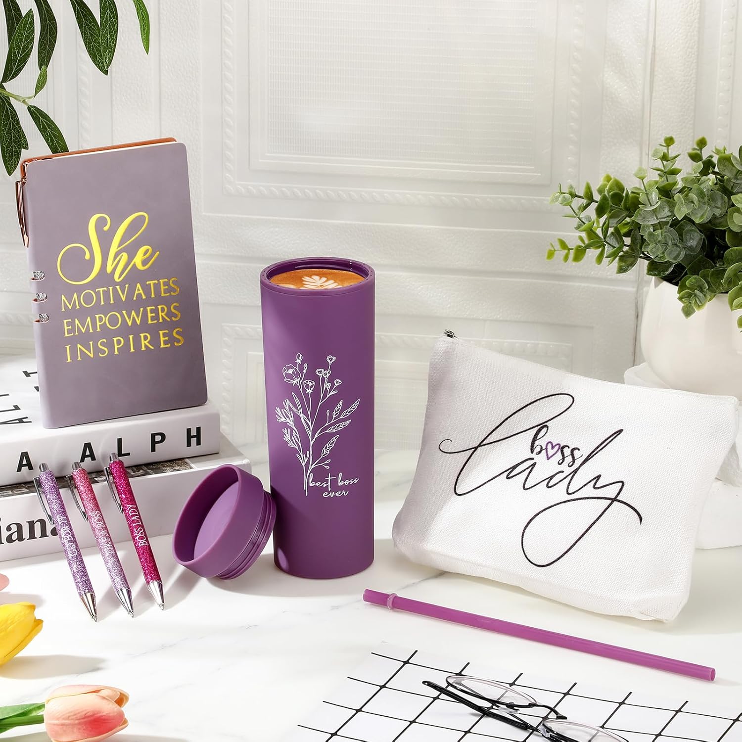 Boss Appreciation Gift Set: experience the joy of our comprehensive leadership ladies Thank You gift set package contains an inspirational plastic cup with straws, 3 ballpoint pens, a PU leather notebook and a canvas bag with inspirational prints that together form a fitting token of thanks to meet any gift giving need