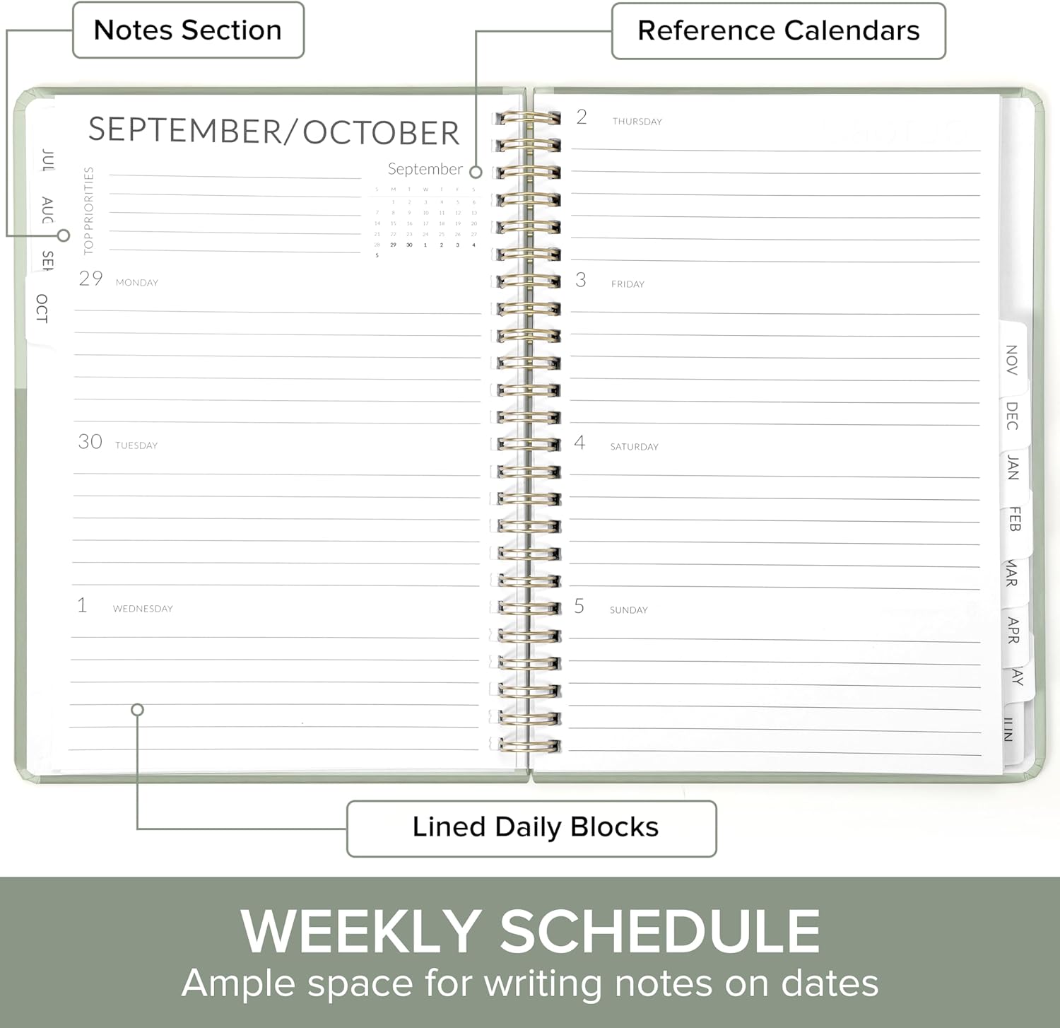 Iâm really impressed with this academic planner! The layout is clean and easy to use, with both monthly and weekly pages that make planning ahead super convenient. It covers July 2025 through June 2026, which is ideal for the school year.The size (8.5âx6.3â) is just rightânot too bulky but with plenty of space to write assignments, meetings, or to-do lists. The spiral binding lays flat, making it easy to write in, and the green cover is calming and professional-looking.It keeps me on track with both work and school tasksâdefinitely a great buy!