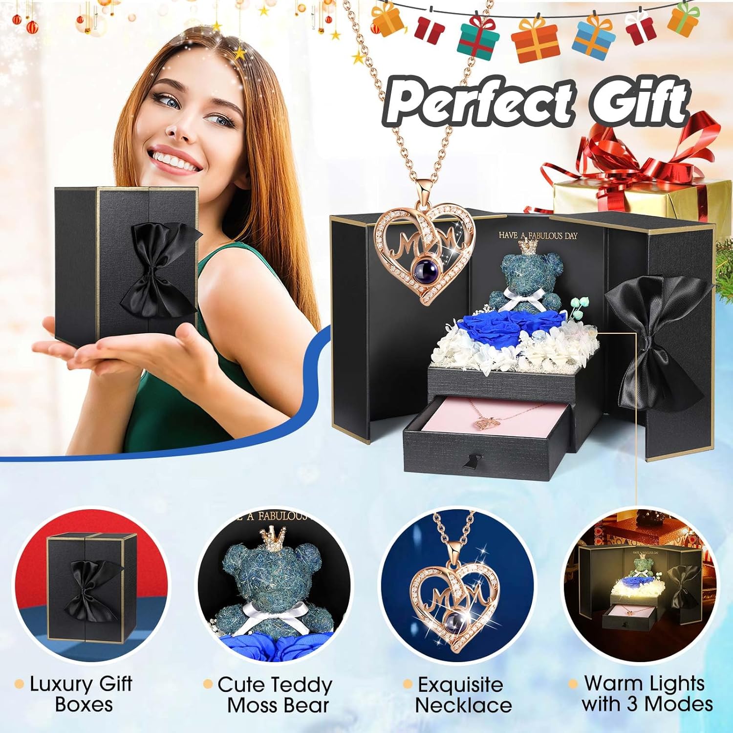 Ich habe dieses Geschenkset bestellt und bin absolut begeistert! Die Verpackung ist sehr liebevoll gestaltet â schon das Ãffnen der Box ist ein echtes Erlebnis. Die Kombination aus der süÃen, kleinen Teddybärfigur, den leuchtend roten Rosen und den zarten weiÃen Blüten wirkt sehr edel und romantisch. Besonders gefallen hat mir die kleine Schublade mit dem hübschen Herzanhänger. Der Schmuck ist hochwertig verarbeitet und funkelt wunderschön â ideal als liebevolle Aufmerksamkeit für einen besonderen Menschen.Auch der Spruch im Inneren der Box âHAVE A FABULOUS DAYâ rundet das Ganze perfekt ab. Insgesamt ein tolles, kreatives Geschenk für Geburtstage, Jahrestage oder einfach nur, um jemandem eine Freude zu machen. Klare Kaufempfehlung!