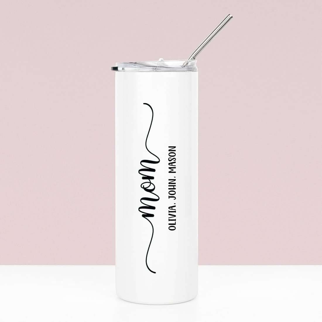 Personalized Mom Tumbler with Straw- Better than the traditional “best mom ever” mug, this mom tumbler with a straw can be used for water, juice, coffee, tea, wine, or any other beverage. Whether you’re a new mama or a seasoned pro, this tumbler is your stylish sidekick for staying hydrated throughout the day. Give a personalized stainless steel tumbler to mom, mother, mama, granny, nanny, mimi, grandma, sister, friend, or mommy to be as a gift of appreciation on Mother’s Day, birthday.