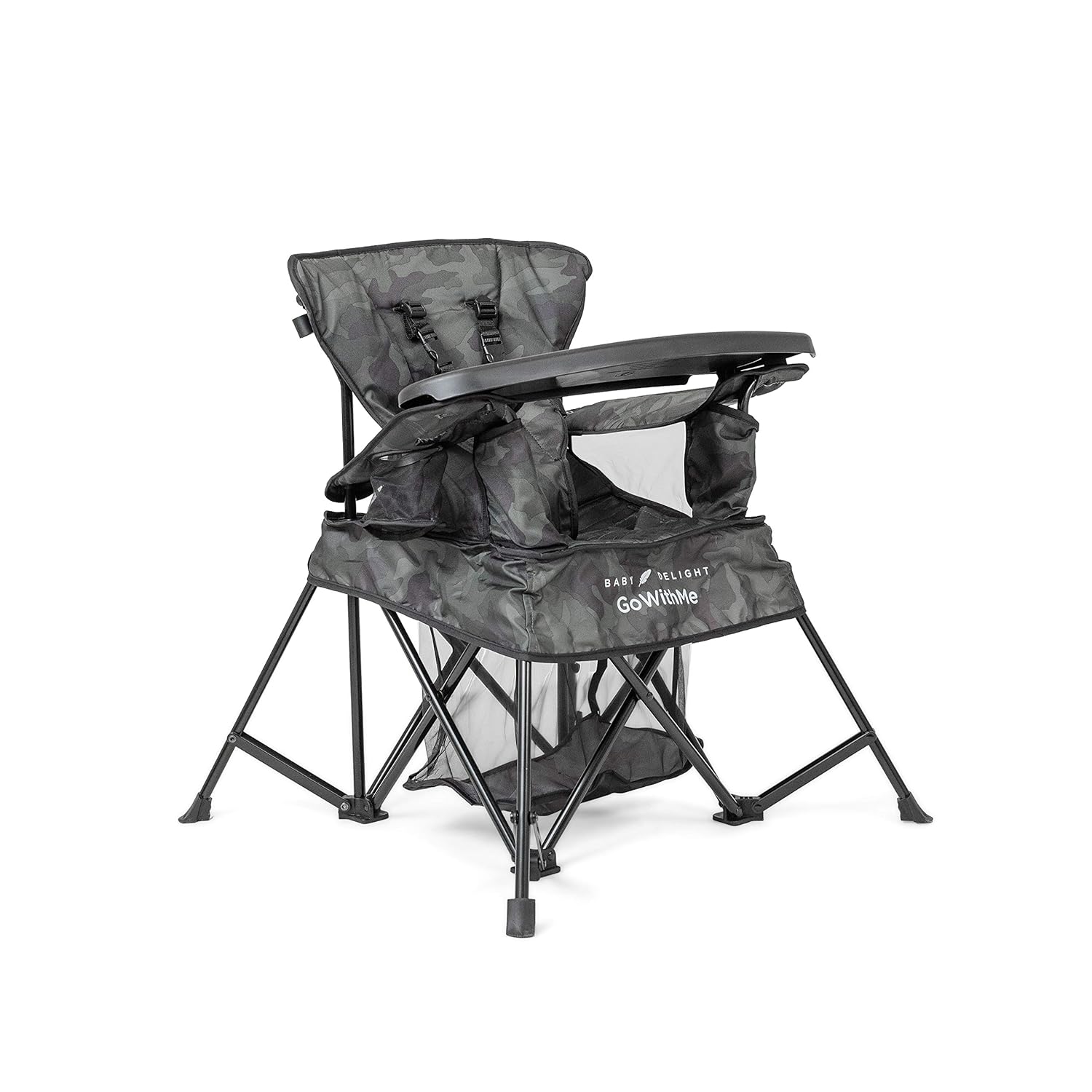Travel with ease using the Baby Delight Go With Me Chair in the Camo style. The 5 point removable harness makes your stable baby secure and comfortable as they sit upright in the seat. As baby grows the seat can unvelcro to reveal two leg holes perfect for letting baby stand with support. The chair can then be used through toddler and big-kid ages, either with or without the snack tray. Indoor/outdoor polyester along with the included sun canopy makes this the perfect chair to carry with you for use outdoors, or anywhere indoors.