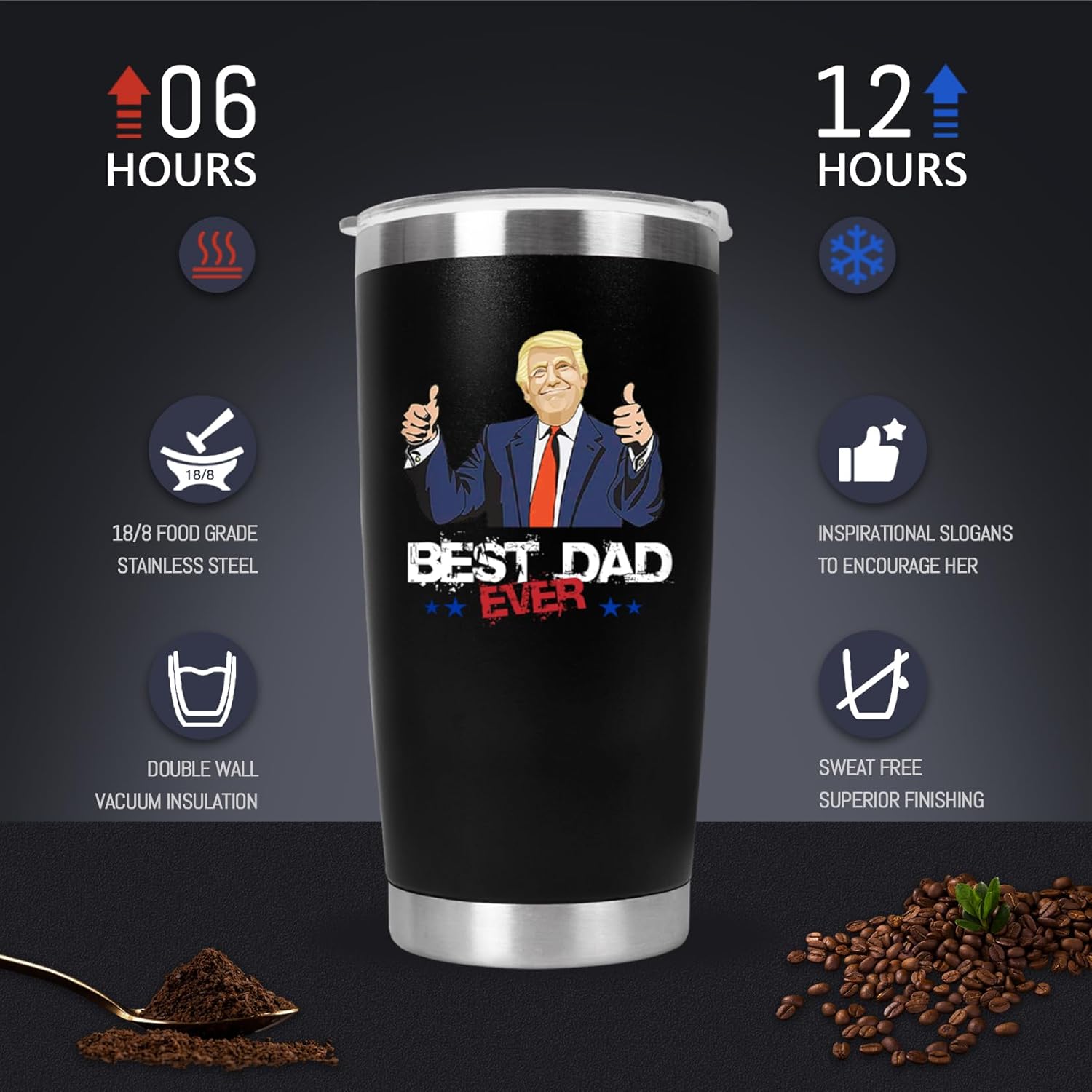 DADS GIFTS IDEAS: This 20 OZ travel tumbler printed funny slogans that express your love for him. Made of 18/8 food-grade stainless steel, this insulated tumbler cup with double-walled vacuum insulation keeps the drinks hot or cold for hours, without worrying about burning his hands or getting wet.
