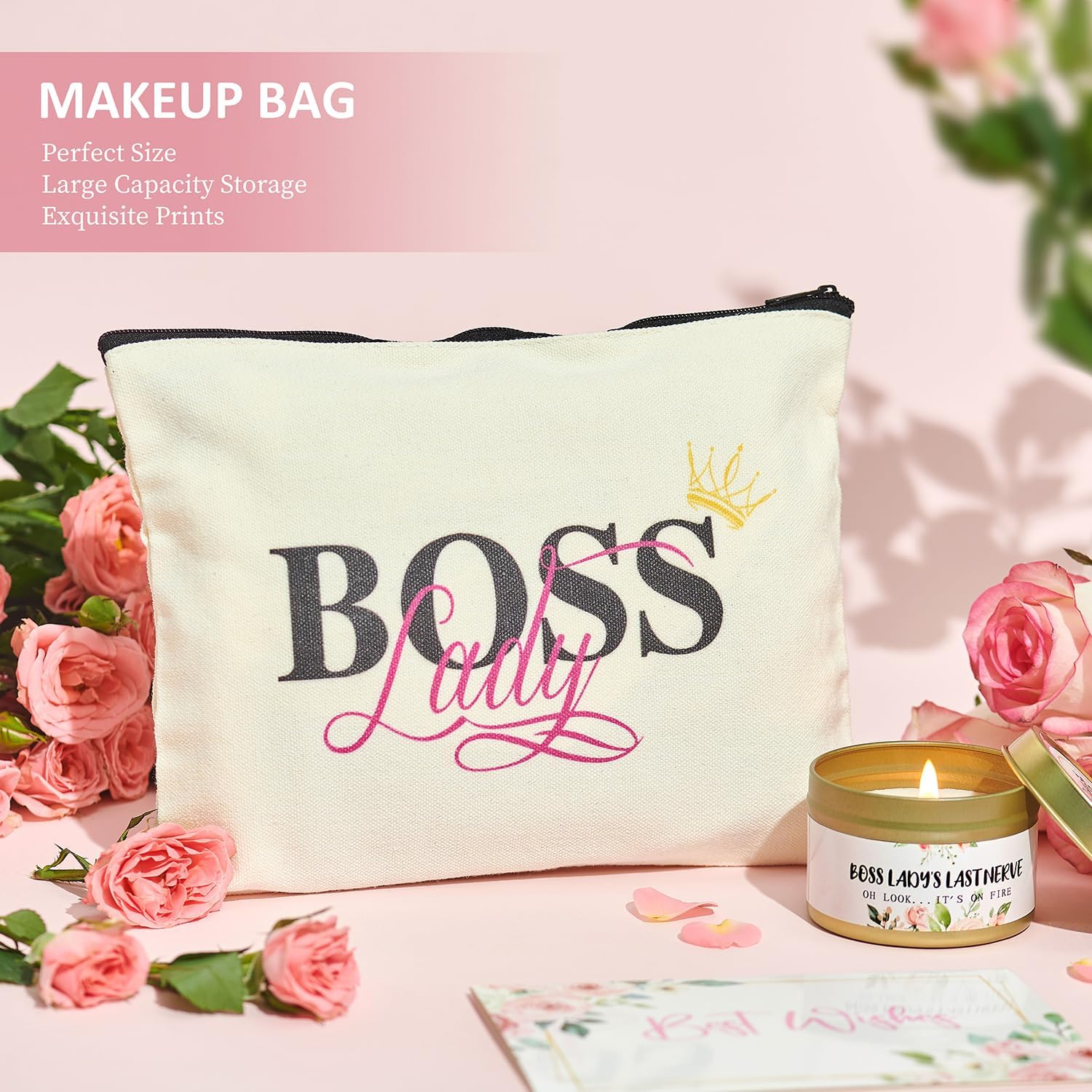 Pink Rose Boss Lady Gift Set: This elegant pink rose-themed gift set is perfect for celebrating your Boss Lady’s achievements or any special occasion. It includes a 16oz glass cup, makeup bag, cozy socks, greeting card, candle, stone bracelet, puzzle keychain, and gift box—ideal for honoring her hard work and the special bond you share