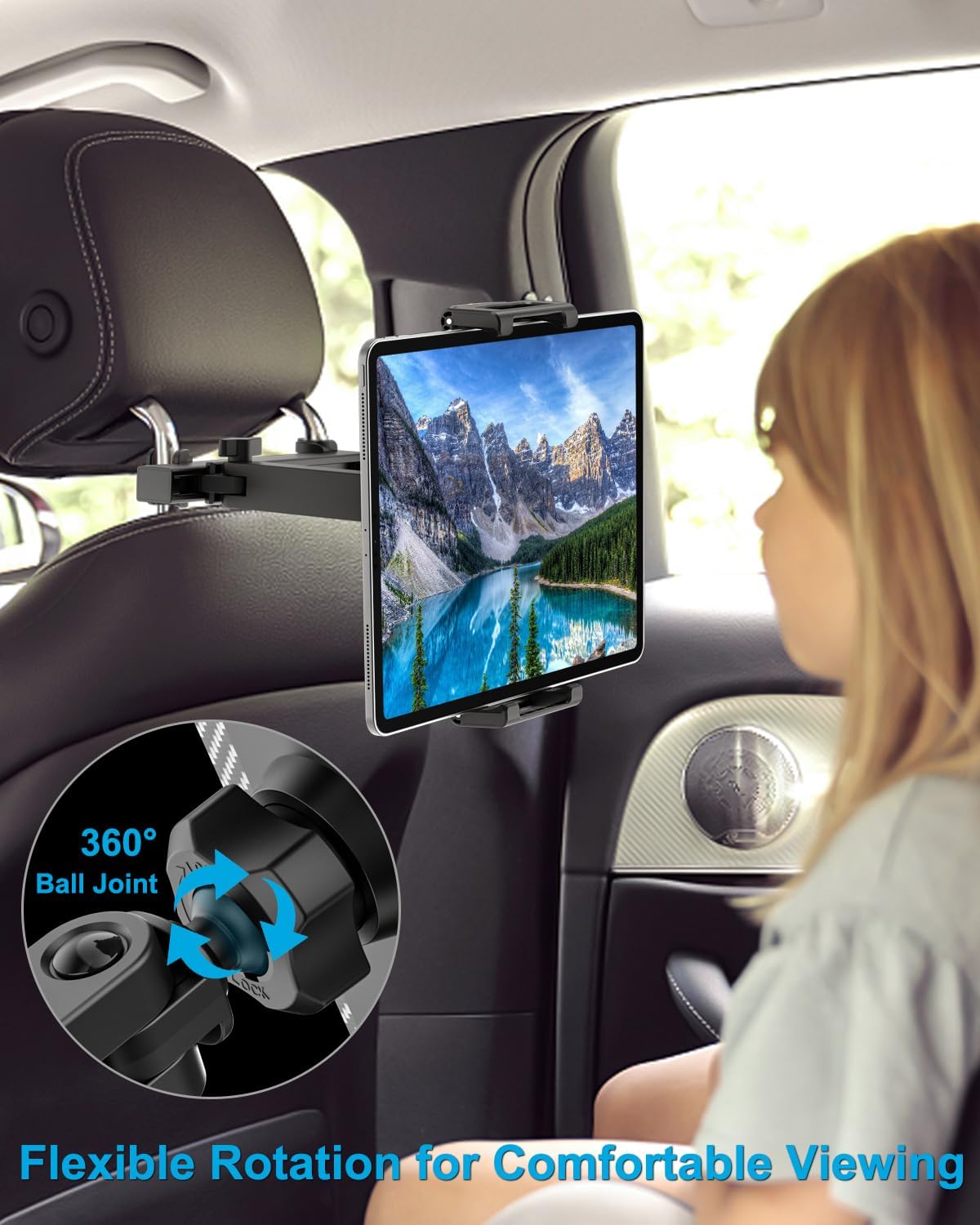 【Upgrade Extension Arm】Slide Rail Design – The arm base allowing moved left and right, you can swing the tablet in the middle of two seats so both passengers can watch. Twist the stretchable arm to easily change viewing distance, 360° rotation ball joint allows for flexible viewing angles, enhancing the in-car entertainment experience. Great for favorite shows or playing games during car travel.