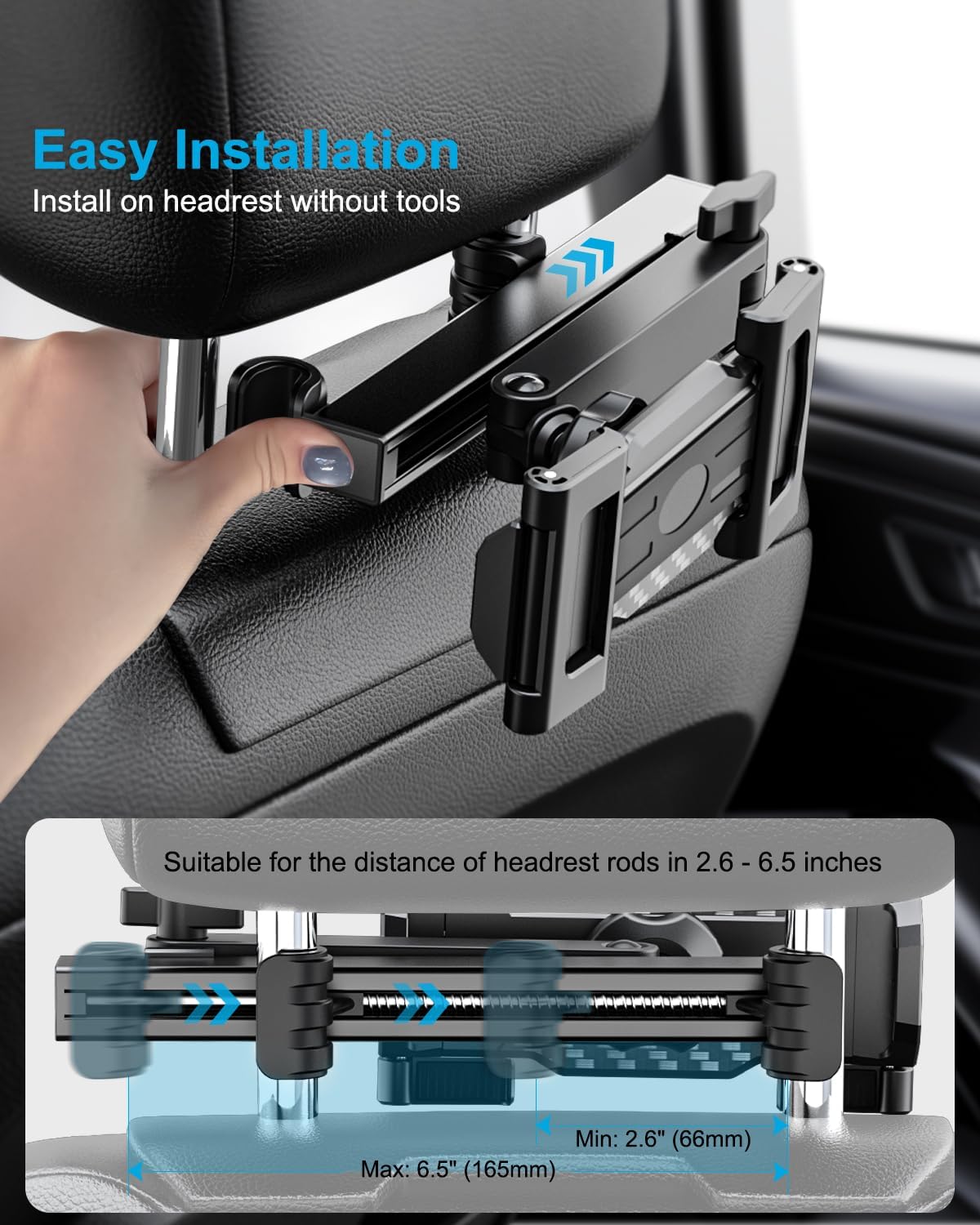 【Easy Installation】No tools are needed, you only takes 3 seconds to install this car seat tablet holder on the retractable legs of the headrest, then place the tablet so you can free your hands to enjoy the roadtrip. The universal car backseat tablet holder fits distance range of headrest rods is 2.6″-6.5″ (66-165mm). Not suitable for cars without headrest poles.