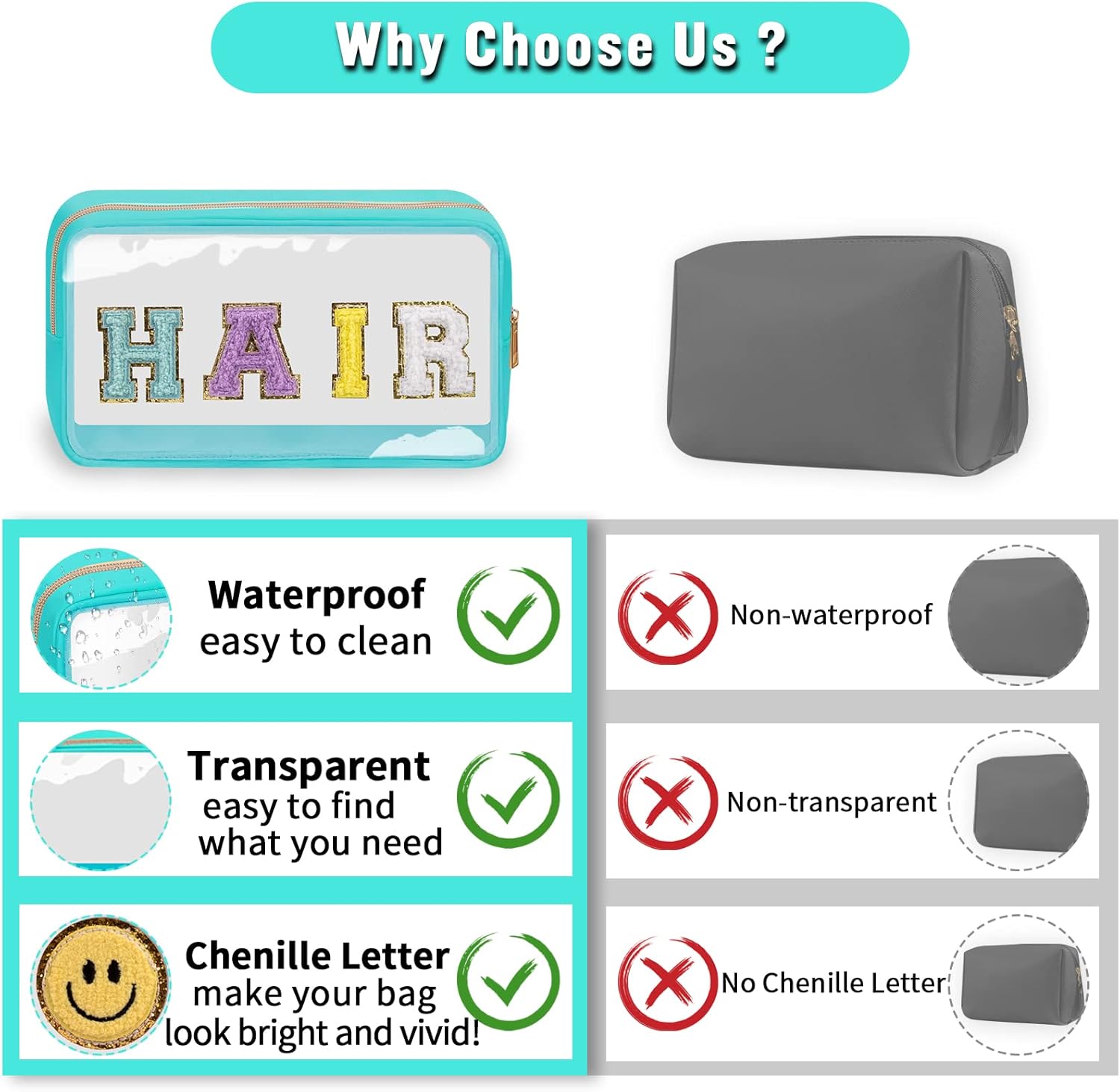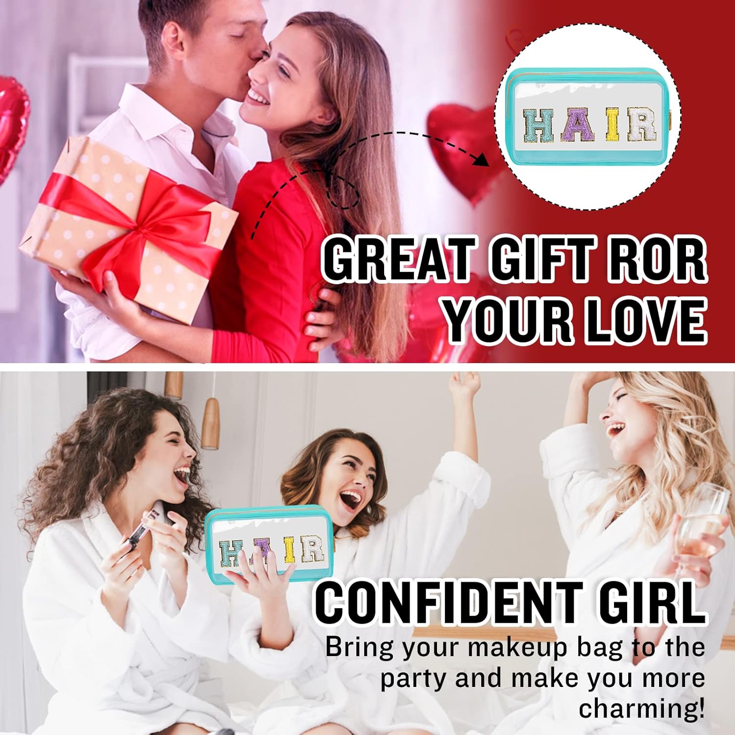 Chenille Letter Clear Makeup Bags Hair Pouch, Preppy Patch Makeup Bag with Zipper, Transparent PVC & Nylon Waterproof Portable Glitter Cosmetic Bag Travel Toiletry Storage for Women Girl(HAIR-Green)