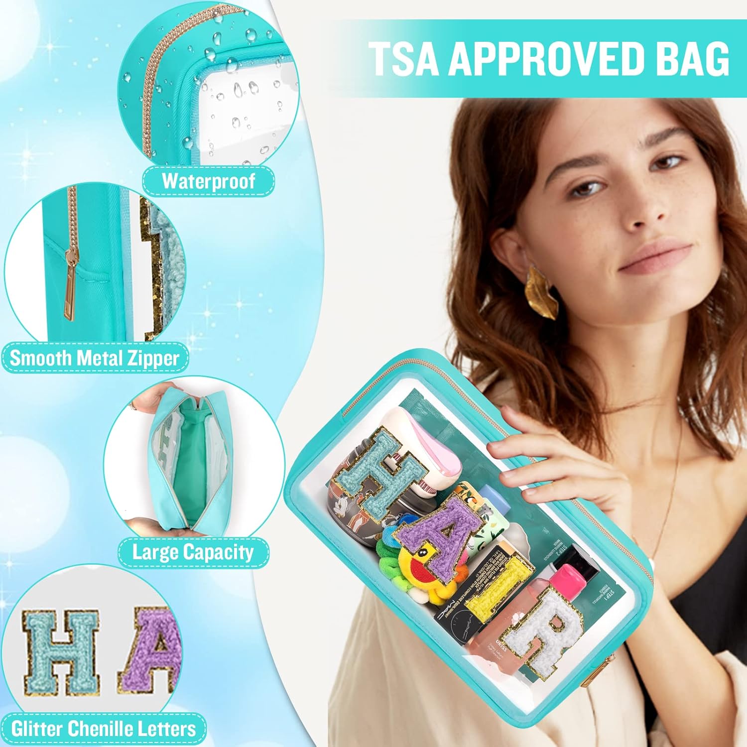 ❤【Glitter Chenille Letter Clear Bag】Preppy makeup bag pouch has gold glitter letter patches and the letters are made of delicate towel embroidery and non-woven fabric. Firmly stained on the bag, you don’t have to worry about them falling off. These colorful letters have a gold glitter border to make your clear makeup bag look very bright and vivid!
