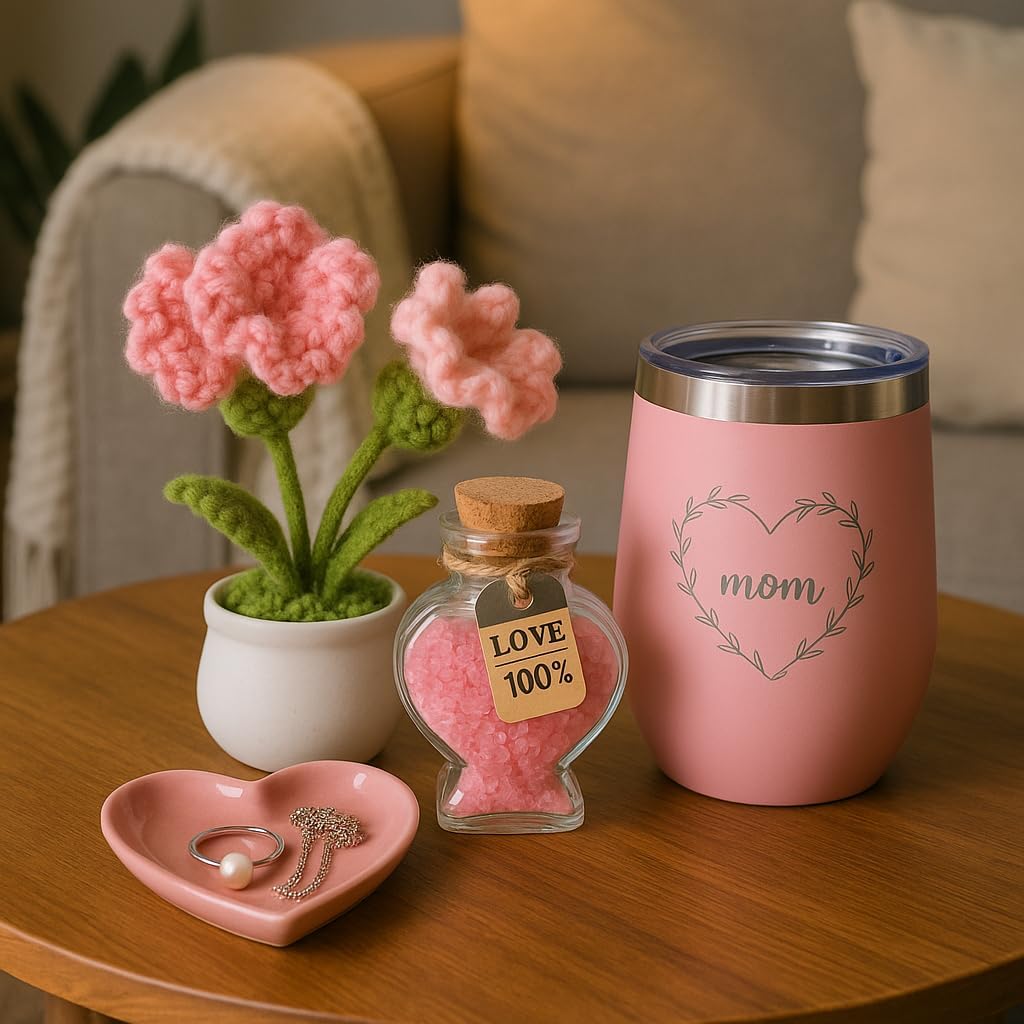 Thoughtful & Heartwarming Gift Set: Celebrate Mother’s Day with this carefully selected set, featuring cozy socks, a stylish mug, a heart-shaped jewelry tray, a bath salt jar, and a charming crochet flower pot.