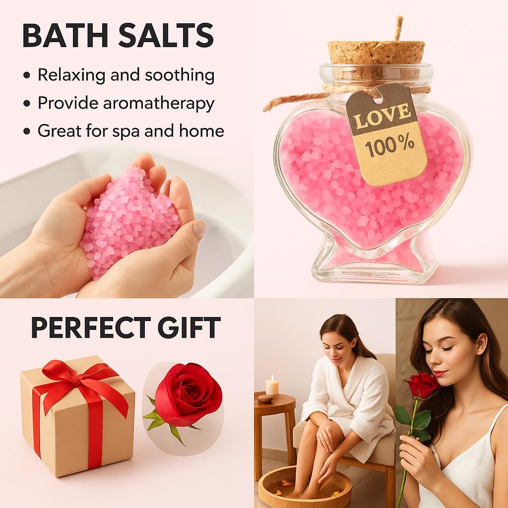 Relaxing Bath Salt Jar & Crochet Flowers: The set includes a heart-shaped jar filled with soothing bath salts, offering a relaxing experience, and a handmade crochet flower pot that adds a unique, creative touch to her space.