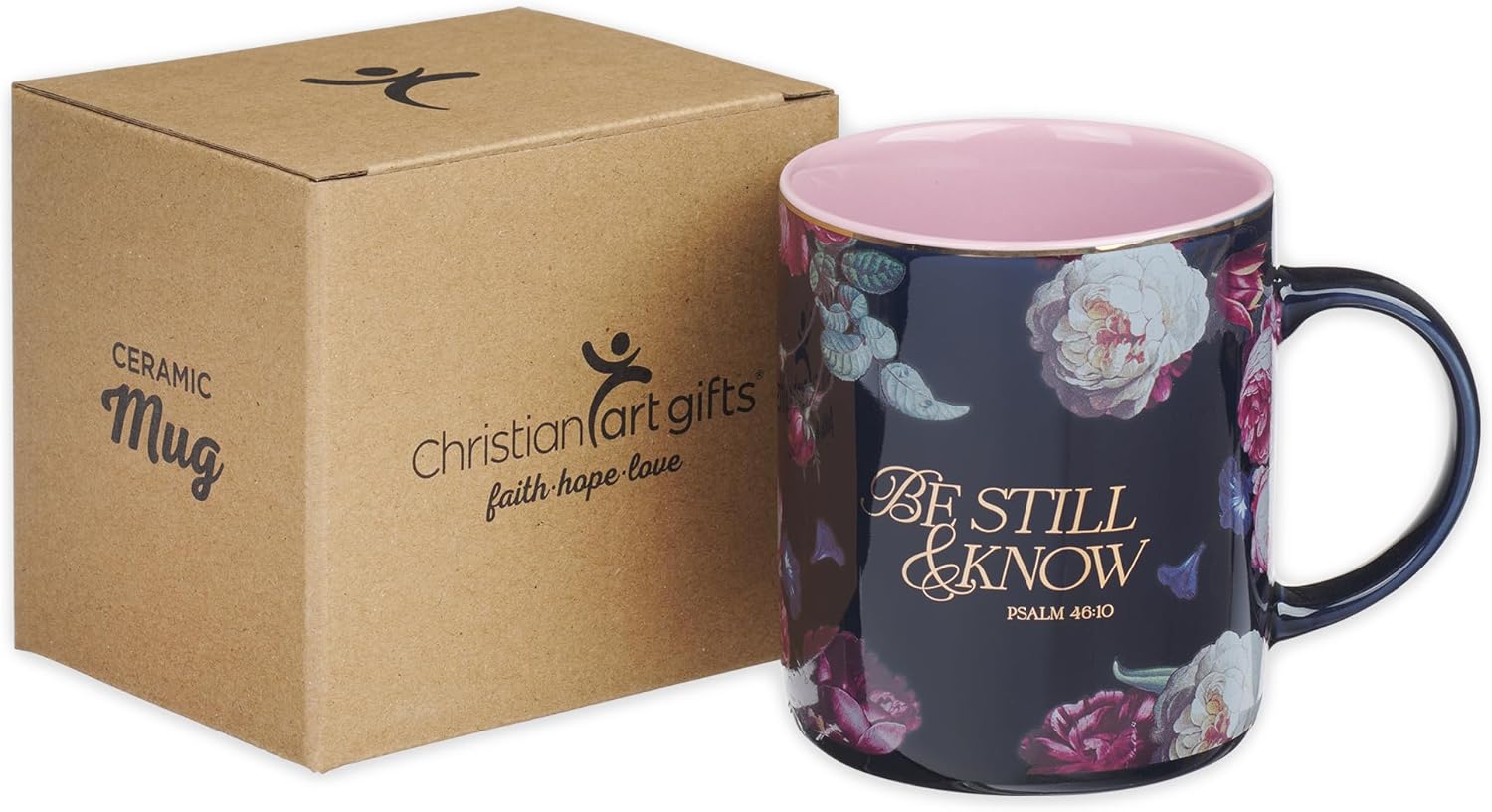 10 reviews for Christian Art Gifts Large Ceramic Inspirational Scripture Coffee & Tea Mug for Women: Be Still & Know Encouraging Gold Bible Verse, Lead/Cadmium Free Cute Drinkware, Dark Navy Blue/Pink Floral, 14 oz.