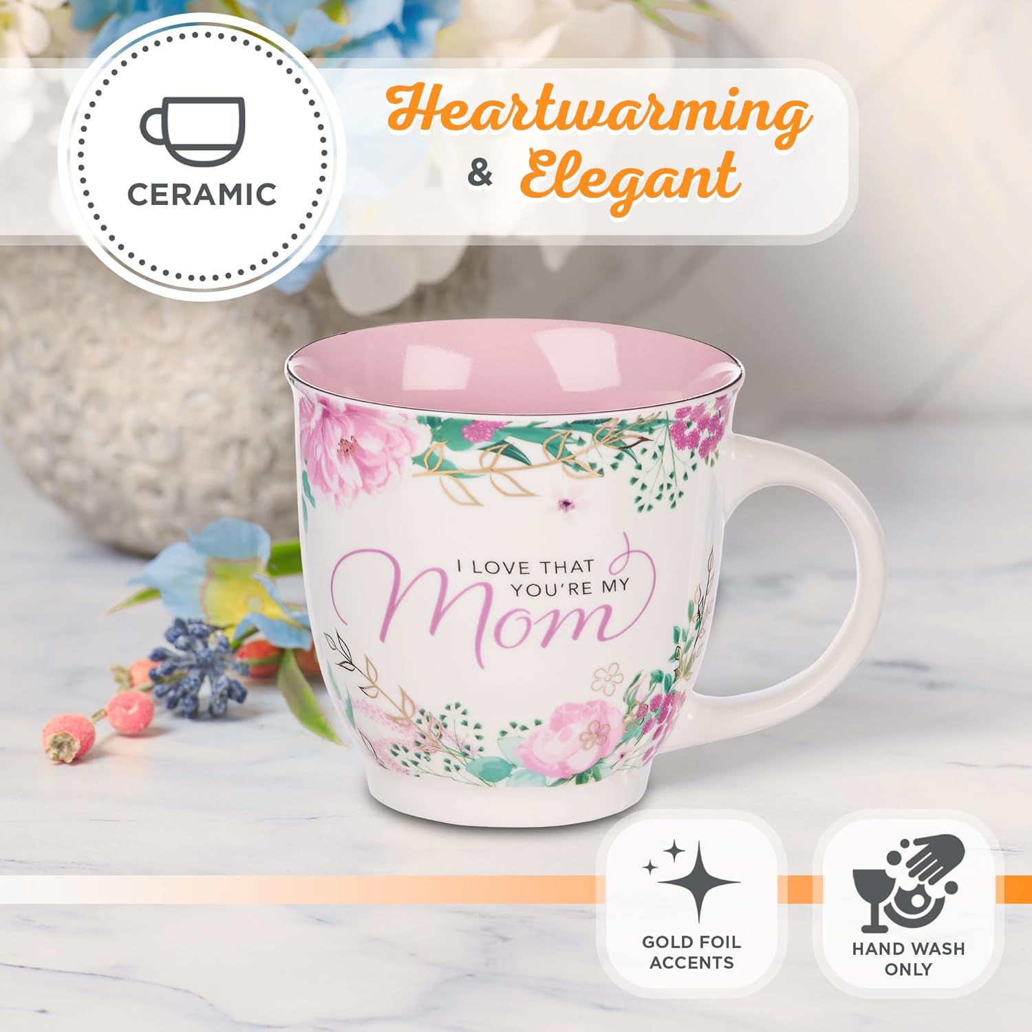 Christian Art Gifts Pink Floral Ceramic Coffee Mug – 14 oz. Lead and Cadmium-free Non-Toxic Inspirational Scripture Coffee and Tea Mug for Mothers with Encouraging Words: I Love That You’re My Mom
