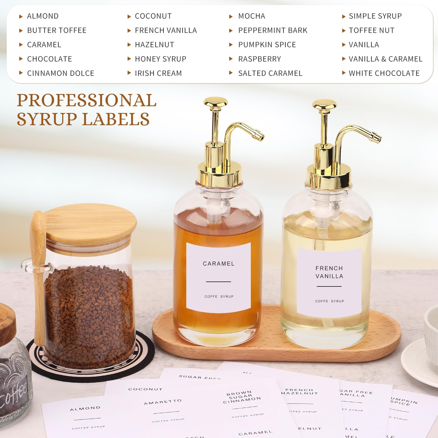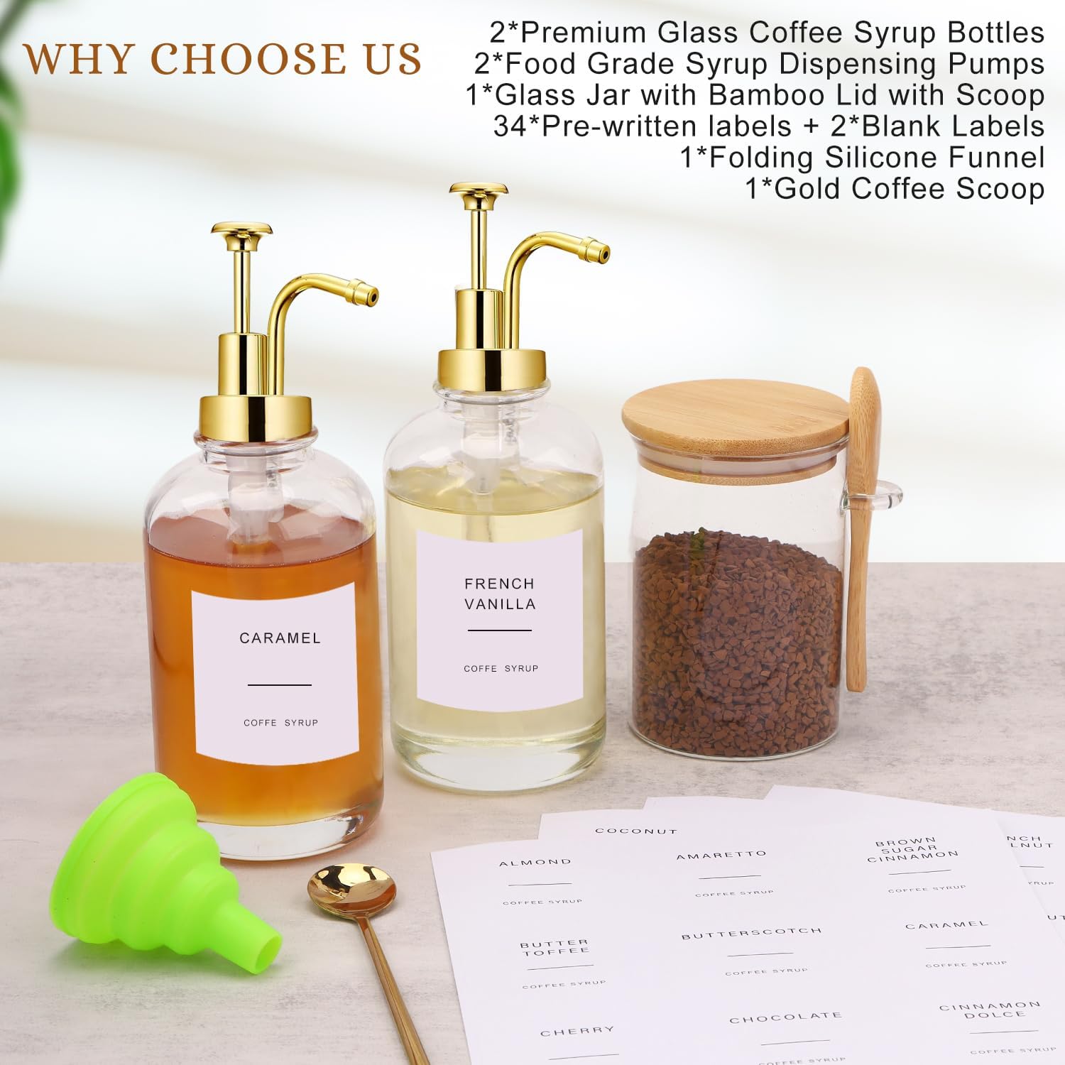Coffee Bar Must Have:This coffee bar accessories includes 2 premium syrup dispenser、 1 airtight glass carafe with wooden spoon、 1 gold coloured long-handled spoon、 1 rubber funnel and pre-printed labels. Functional and stylish all in one