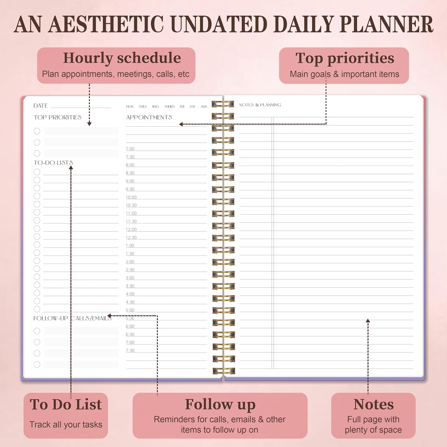 Start Anytime, Beat Procrastination: This undated daily planner allows you to start whenever you’re ready. Cultivate productive habits, overcome procrastination, and make every day count with its flexible hourly planning format