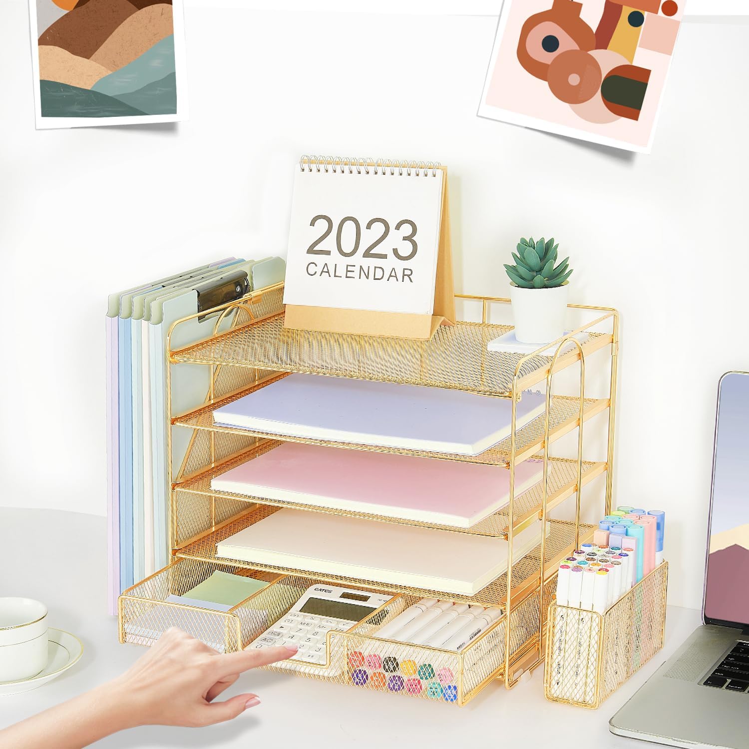 Desk Organizer with File Holder, 5-Tier Paper Letter Tray File Organizer with Drawer and Pen Holder, Metal Desk Organizers and Storage for Woman School Office Supplies Storage(Gold)