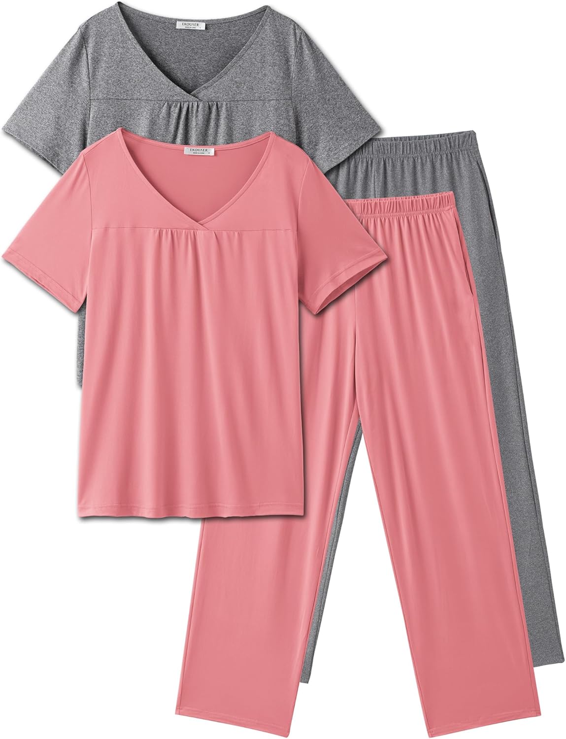 Ekouaer 2 Pack Womens Pajama Sets Short Sleeve Sleepwear Top with Long Pants Comfy Lounge Sets S-XXL