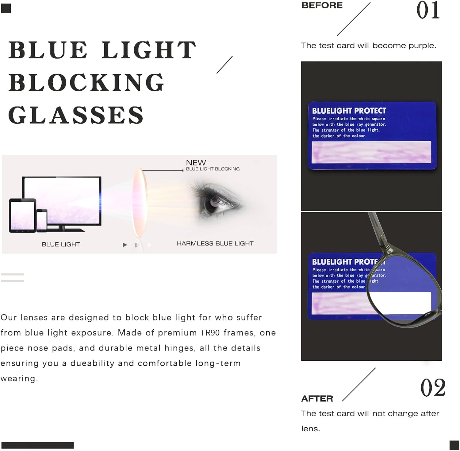 【BLUE LIGHT BLOCKING LENS】- FONHCOO blue light blocking lens are made from lightweight and shatterproof poly-carbonate which blocks over 99% of the harmful blue light spectrum(380nm-420nm). Say goodbye to the headaches and eye-strain driving you crazy with our computer glasses. The lenses are then topped off with an anti-glare coating and an anti-scratch layer which make it impact resistant and durable for the use.The blue light glasses are clear that won’t alter your color perception.