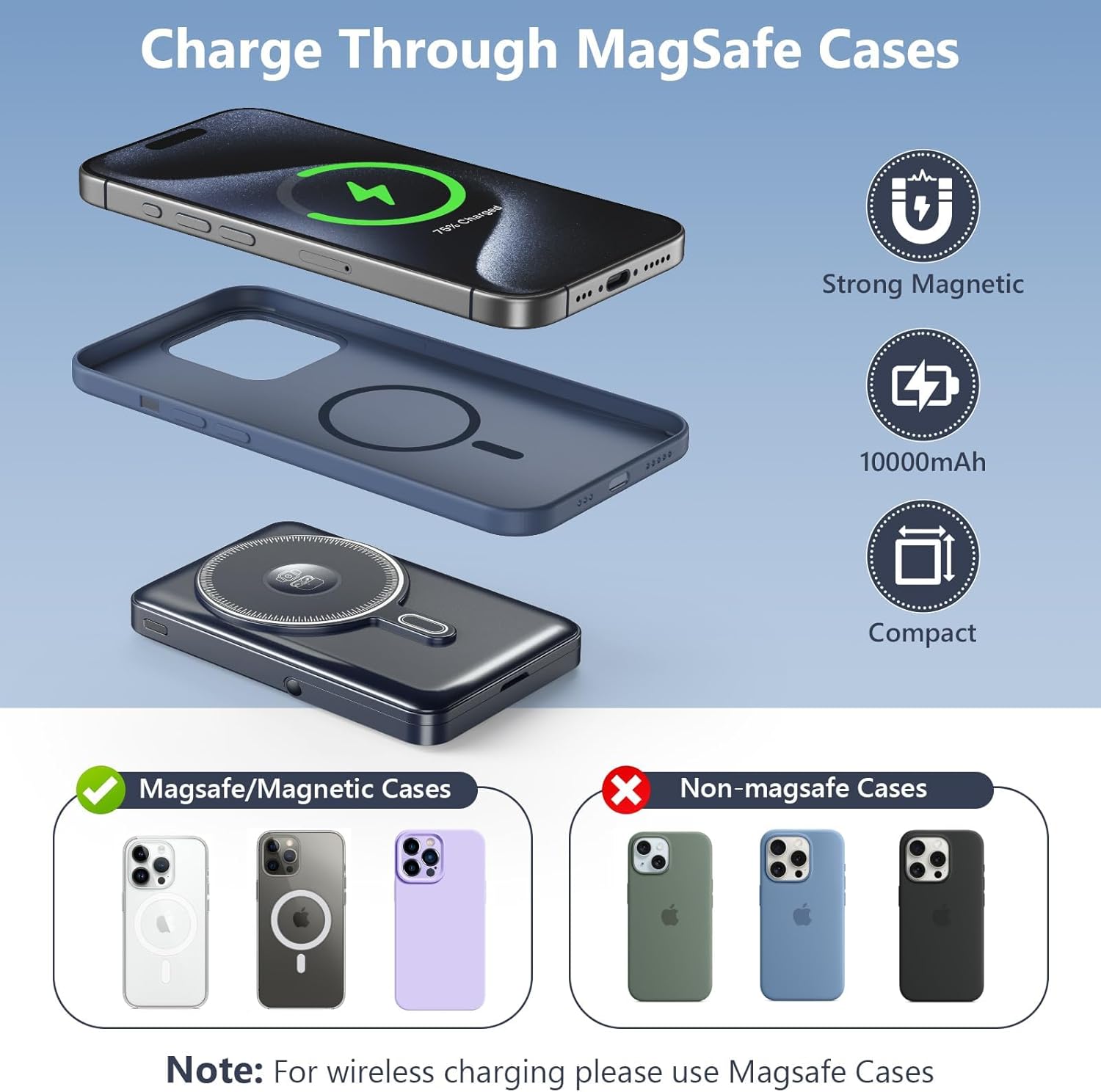 For Magsafe Power Bank: The all-in-one portable charger combines wired and magnetic wireless charging. The magnetic power bank supports 5W, 7.5W, 10W and 15W wireless charging. Not only does it support wireless charging for iPhone, also supports Apple Watch, and AirPods; the USB-C port and wired port supports up to 20W of power output, allowing for fast charging of USB-C enabled devices; the iOS wired port support up to 15W of power output. Supports simultaneous charging of multiple devices.(Note: Requires press the power button once to activate wireless charging)