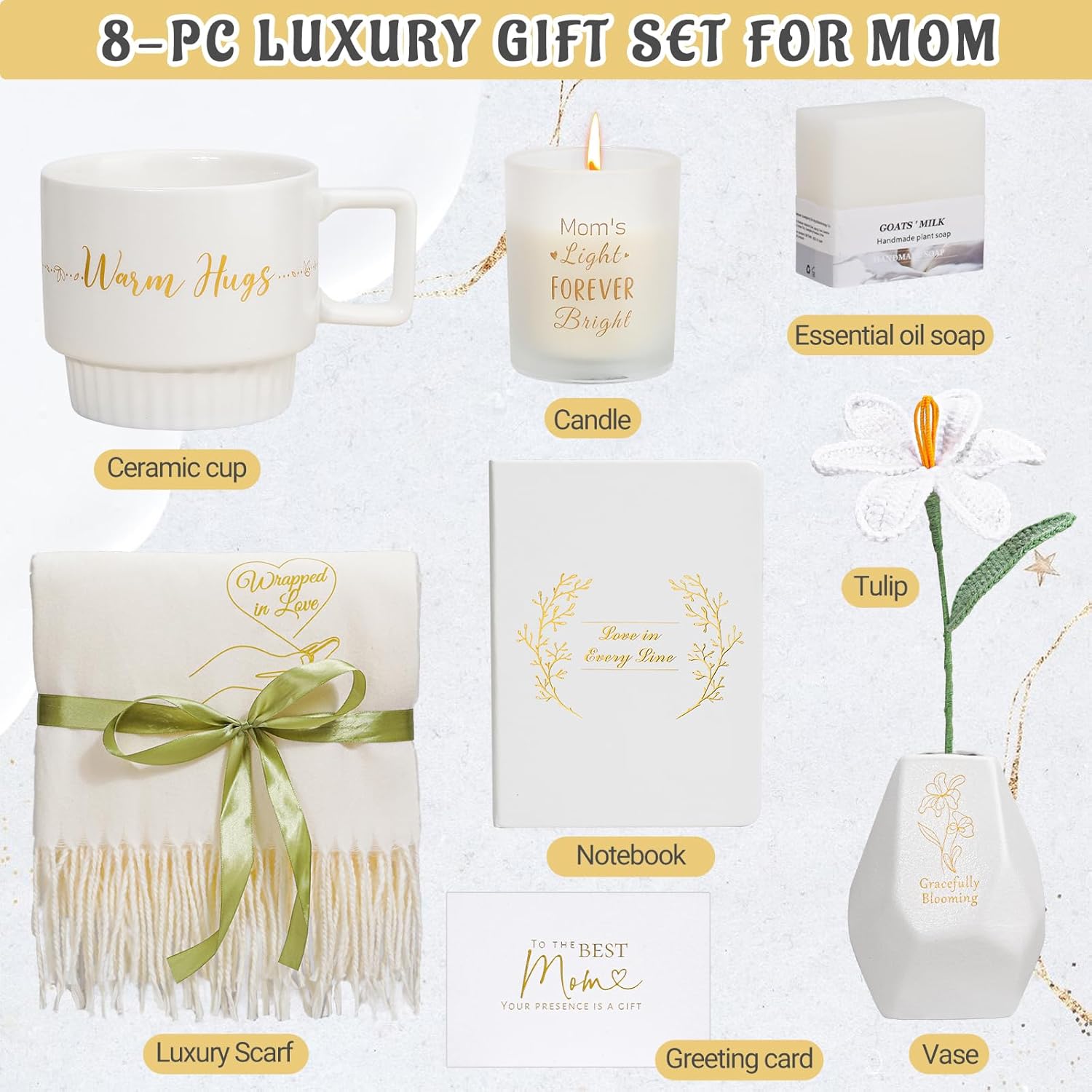 Gifts for Mom from Daughter Son Husband, Gift Basket for Moms, Mom Birthday Gifts Set Include Scarf Notebook Vase Cofee Mug Candle