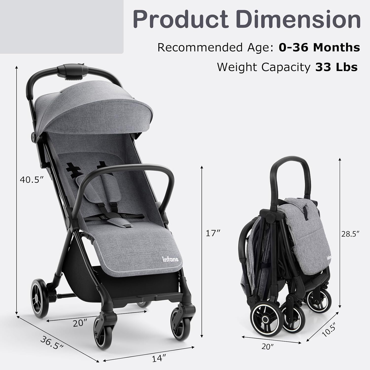 Ultra-lightweight:INFANS compact stroller weighs 15 pounds and measures 20 “x 10” x 28.5 “(L x W x H) when folded. It can fit in most aircraft overhead bins or car trunks and is perfect for travel or daily outings. Suitable for infants up to 33 pounds between 6 and 36 months of age.