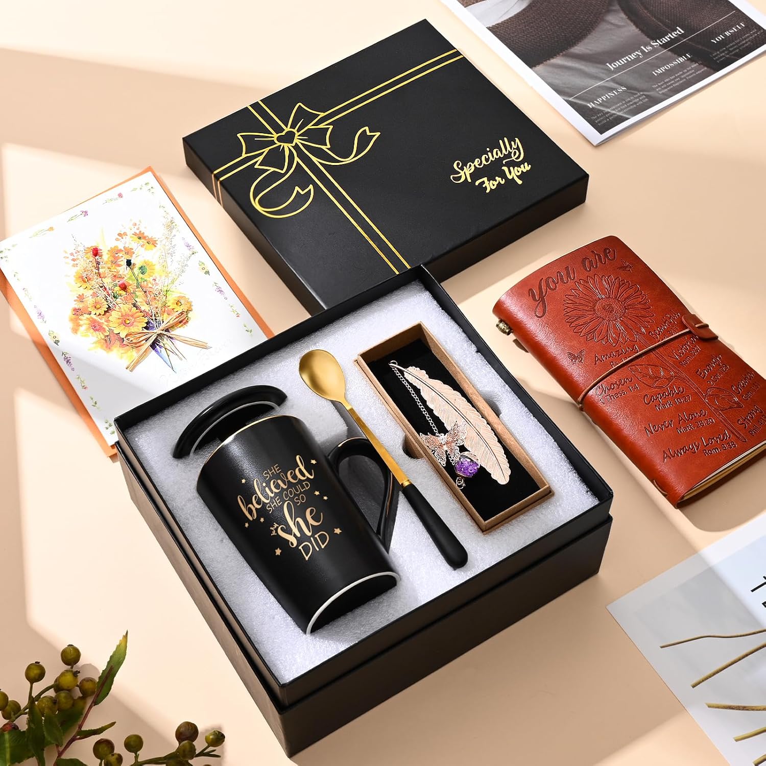 EXQUISITE GIFT COLLECTION: Present her with this ready-to-give graduation gift for her, beautifully boxed and complete with a 14-ounce mug, matching lid and spoon, a sleek notebook, an elegant metal feather bookmark, and a lovely sunflower card—each item thoughtfully chosen to celebrate her achievement with style and utility.