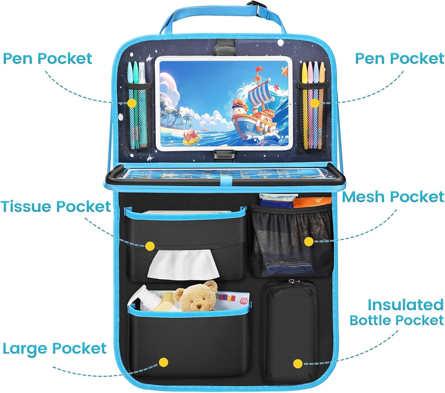 Keep Car Organized & Tidy: The car backseat organizer with tray(23.9×16.5inches)has 7 pockets, including tissue pocket and insulated bottle pocket, etc. The insulated bottle pocket can effectively keep bottles warm, while the tissue pocket’s center opening design allows easy access to tissues. Whether storing pens, toys, snacks, the backseat tray table for cars kids helps you keep car tidy and everything within reach. The tray has 1 art card, allowing kids to display imagination and creativity