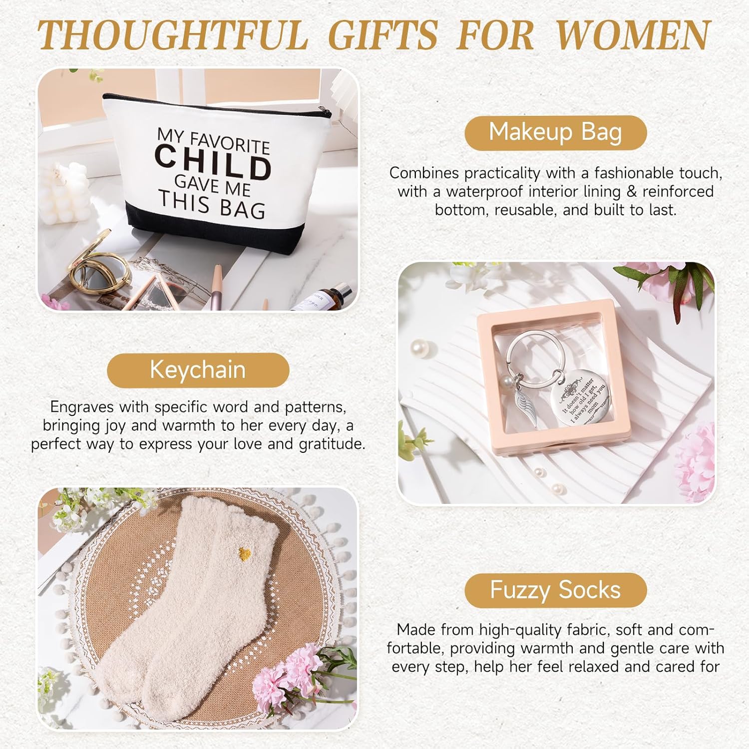 【MOM BIRTHDAY GIFTS】A 16-ounce glass coffee cup, a spacious and practical tote bag, a meaningful keychain, soft and cozy plush socks, and a scented candle that brings a calming atmosphere—paired with a heartfelt message on a gift card—are sure to bring a smile to her face and let her know just how much you care. It’s the perfect time to show your love and appreciation for mom with a thoughtful gift.