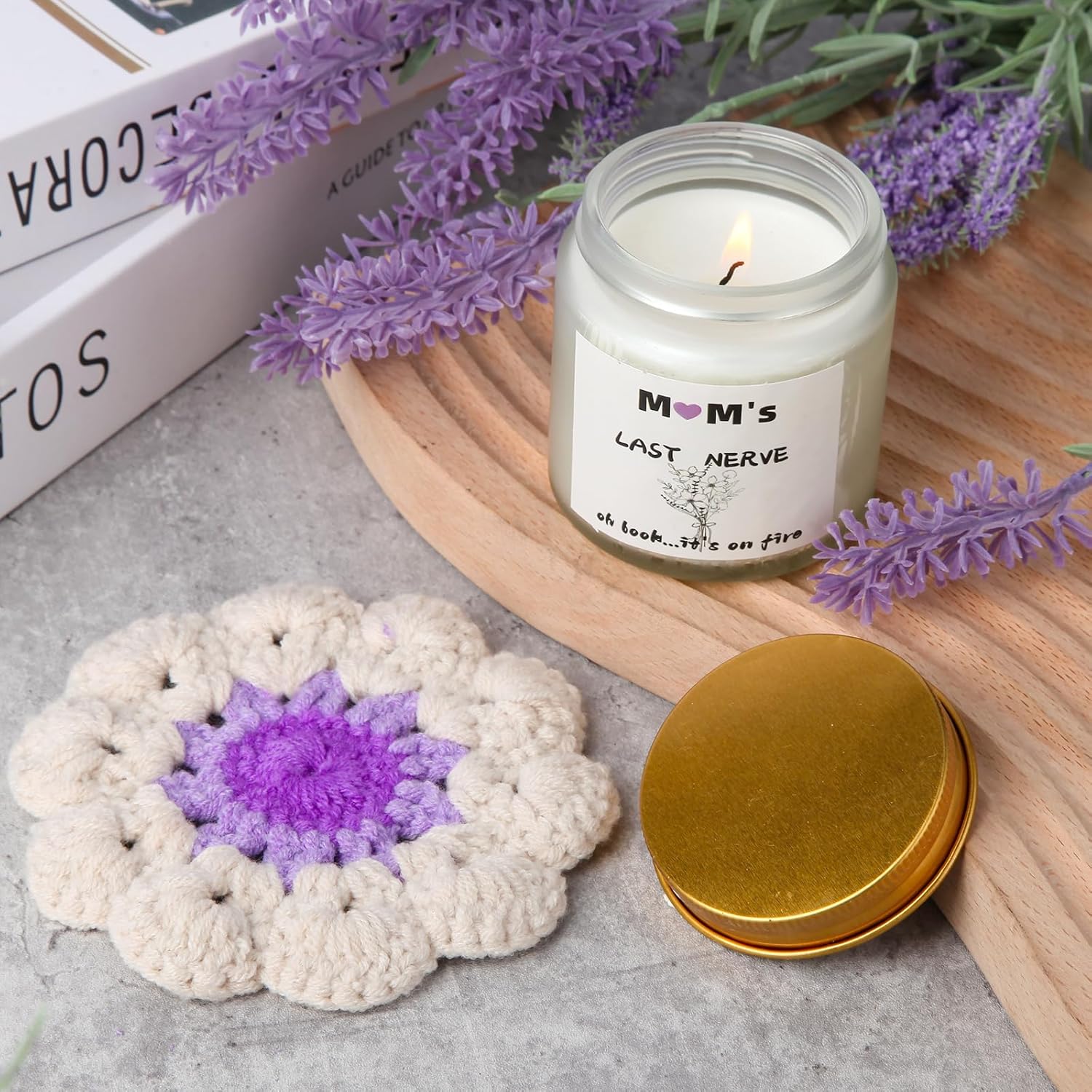HUMOROUS “MOM’S LAST NERVE” SCENTED CANDLE: A playful label adds humor, while a calming lavender fragrance helps her unwind. Encourages her to take a moment for herself—because she deserves it!