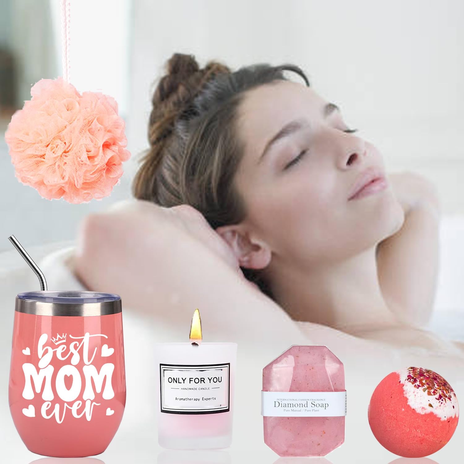 Mothers Day Gifts for Mom, Mom Birthday Gifts From Daughter Son Best Mom Ever Spa Gift Basket Set Wine Tumbler Stainless Steel Straw Scented Candle Bath Bomb Soap