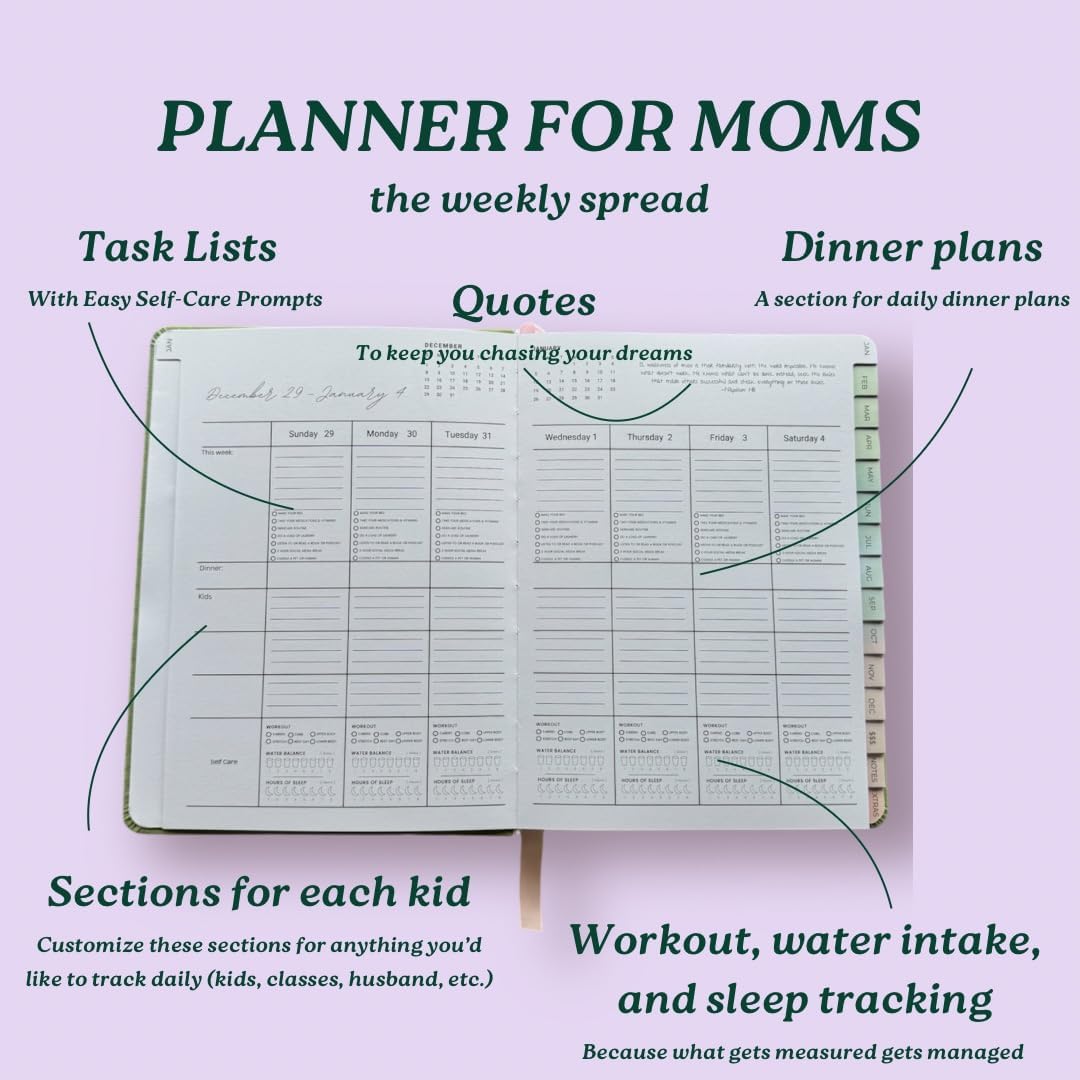 Ample space for mom weekly and daily tasksCustomizable sections for each kid (or anything you’d like to track daily)Pencil in your daily dinner plans into the dedicated sectionQuick and easy prepopulated mental/physical self-care tasks you can check off dailyA section to document you water intake, exercise, and hours of sleep daily