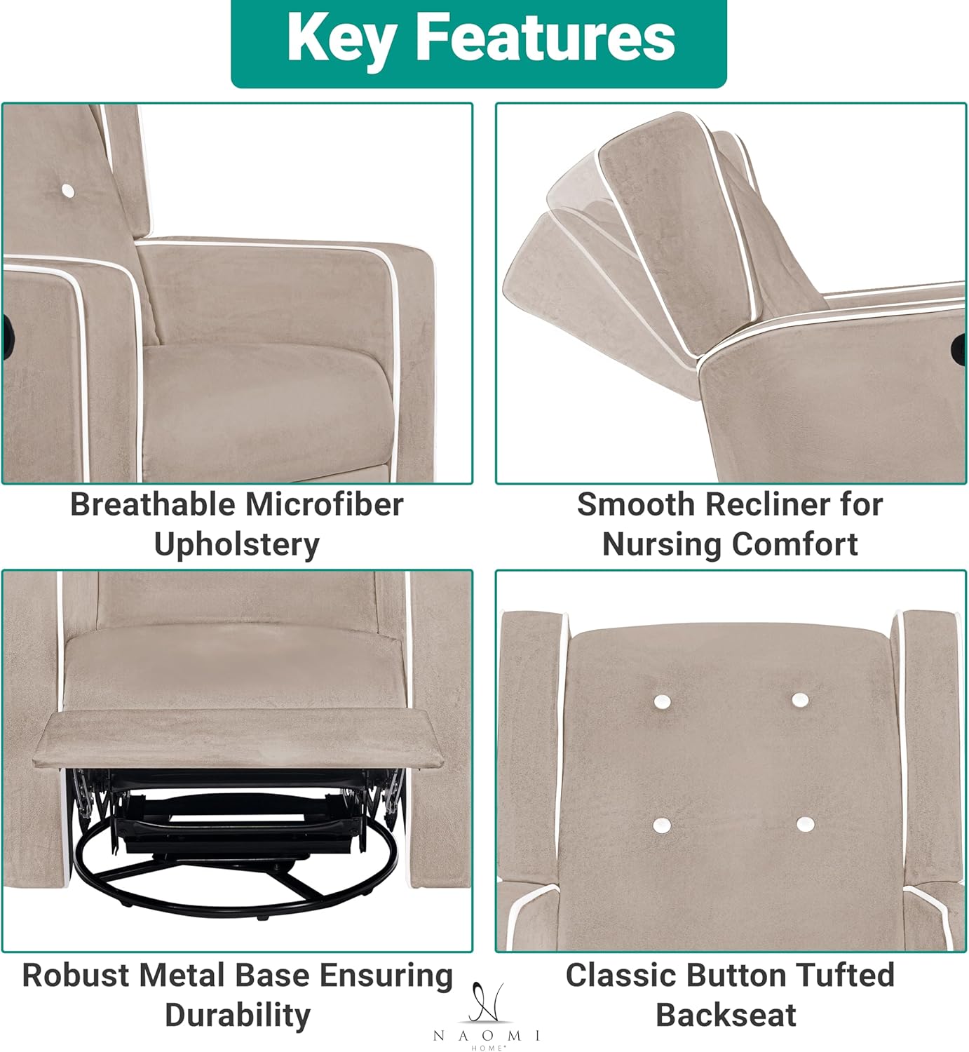 Adjustable Positions: Enjoy customized comfort with our adjustable recliner chair, featuring an easy-operation lever that allows you to find your ideal position between 90° and 135°. The Naomi Home swivel glider rocker recliner chair is perfect for reading, watching TV, relaxing, and even sleeping.