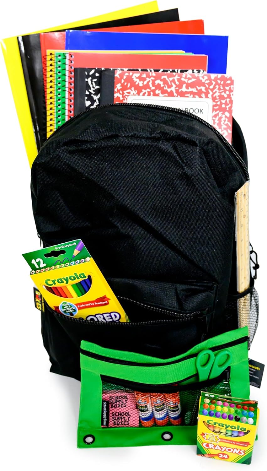 School Supply Boxes | 17″ Solid Black Backpack Bundle for Elementary School | Back to School Bookbag with Supplies | Contains Crayons, Colored Pencils, Ruler, Disappearing Glue, Notebooks, and more