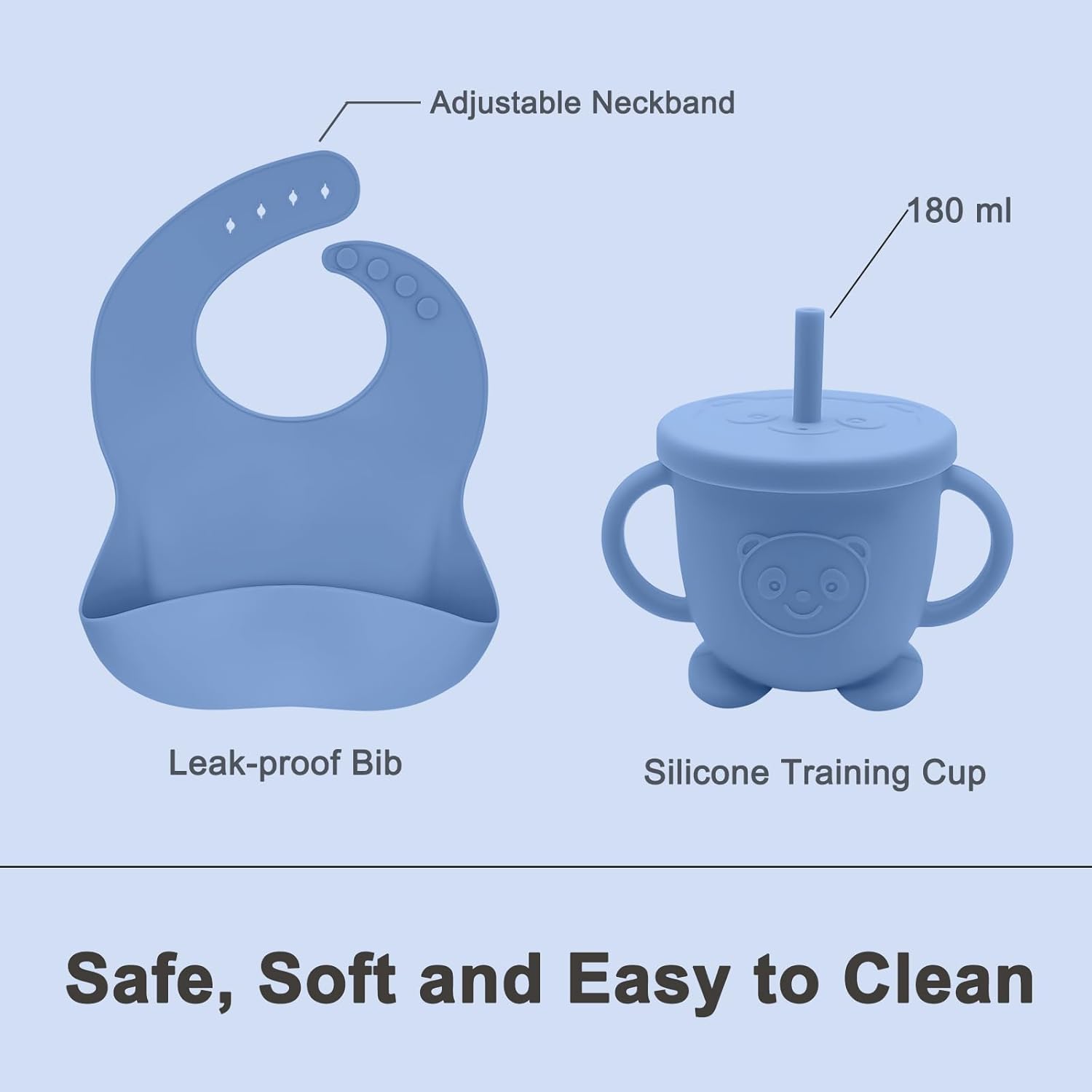 Silicone Baby Feeding Set: Our Baby Led Weaning Set includes everything to help your baby transition to independent feeding. Baby feeding supplies include 1 baby suction plate with divider, 1 suction bowl, 1 adjustable bib with food catcher, 1 training cup with straw and lid, 1 spoon, 1 fork, 1 baby spoon, 1 baby fork. If you want to transition your baby to solid food, our baby weaning set is the best choice for you.