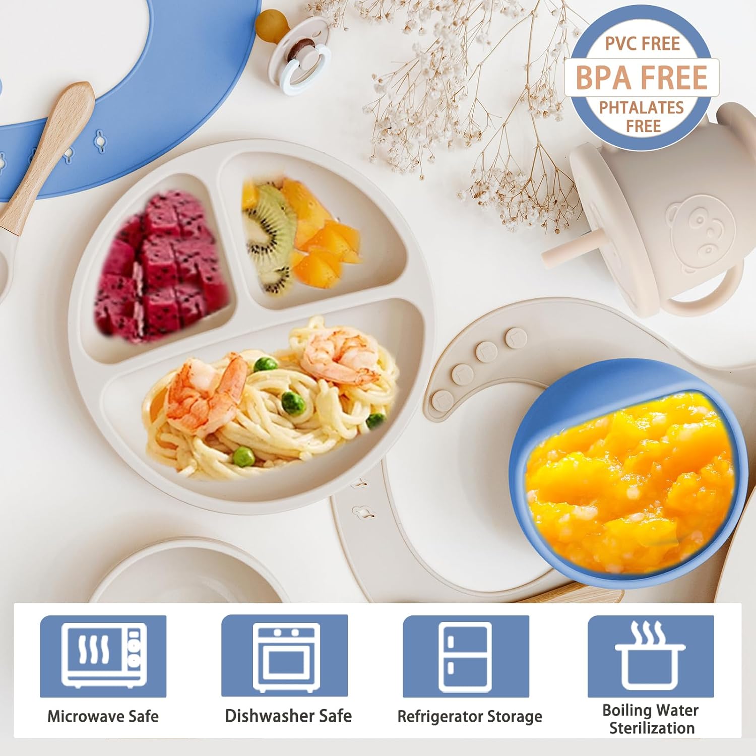 Safe & Baby-Friendly Materials: Considering your baby’s health, every item in our baby feeding set is made of 100% food-grade silicone and natural beech wood, BPA-free, non-toxic, lead-free, phthalate-free, PVC-free, so our baby plates and bowls set is absolutely safe and healthy for your baby to eat and chew.