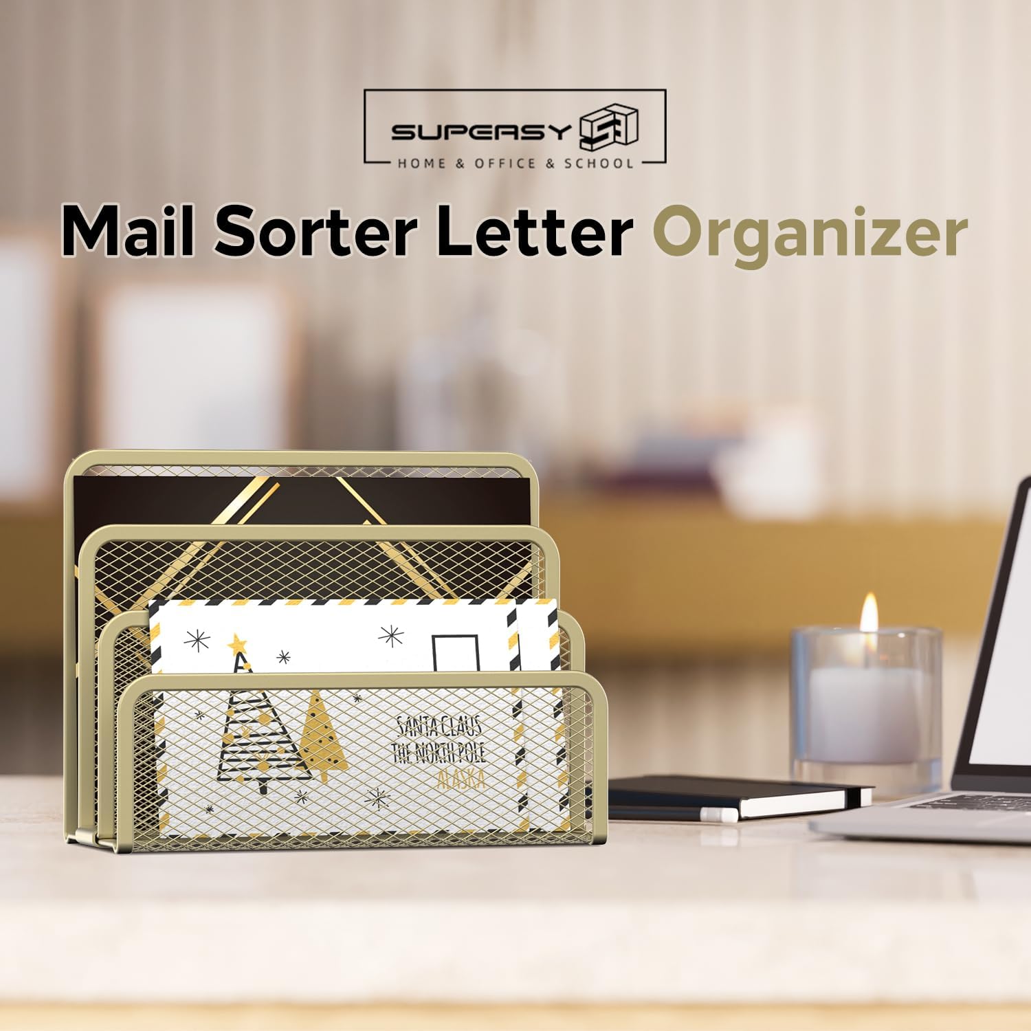 SUPEASY Desktop File Organizer, Mesh Metal Mail Holder Countertop with 3-Slot Letter Sorter, Office Envelope Organizer (Yellow)
